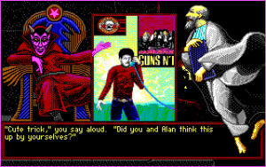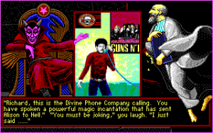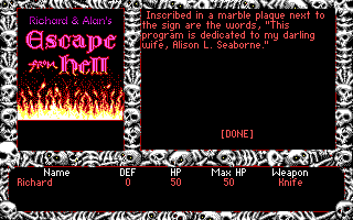 Escape from Hell had a lot of notable people working on it. Richard is named after the game designer, Richard L Seaborne. He designed and programmed the cult “classic” Awesome Possum Kicks Dr. Machino’s Butt. And Alan is named after Alan J Murphy, who did the graphics for Escape From Hell. His career is pretty expansive, including Atari ports of Hard Drivin’, Gauntlet, Xevious, Pac-Man, Defender, Blasteroids, and many others. He also worked on Fountain of Dreams, Frequency, B.O.B., Awesome Possum, and lots of other games from before EA became the sports juggernaut it is today. The producer was Dave Albert, who was also the producer of Wasteland, The Bard’s Tale III, and the executive producer of Gex: Enter the Gecko on the N64. He also designed and programmed Fountain of Dreams.