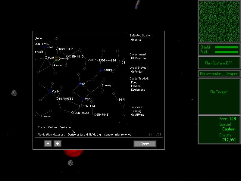 The (primary) plot of the game takes place in 2156, nearly 90 years before the original Escape Velocity. Currently, the humans are in the middle of the war between the alien race mentioned in the first game (known in this game as the “Voinians”), and instead of the confederacy, the humans are called “UE”, or “United Earth”. Your character’s back story is still the same, you start with a shuttle on Earth, and you have to go out and make your fortune.