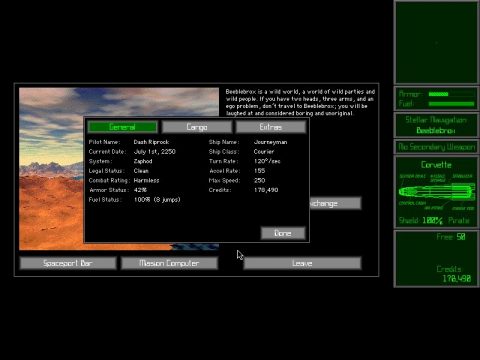 EV is the kind of game in which you could tell it was made by people who love playing games. There are tons various geek references to Star Wars, Star Trek and the LOADS of references to Mystery Science Theater 3000 (Here is a screenshot for a veritable torrent of Douglas Adams allusions, featuring planet Beeblebrox of the Zaphod system, and your combat rating can be classified as “harmless” or “mostly harmless”). The game is made to be very open ended, and a lot of fun, no matter how you want play to play it. It is this expansive format that was taken to new heights when Ambrosia created the game’s much revered sequel.