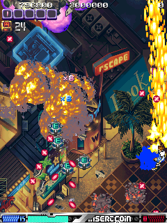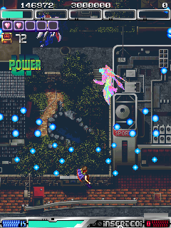 Cave’s ESP Ra.De. (pronounced “esp-raid”) is conceptually quite different from typical shoot-em-ups. Rather than taking the role of spaceships or other similar vehicles, you control one of three espers – that is, humans with extra sensory powers – who have the ability to fly and shoot lasers from their hands. It’s set in futuristic Tokyo in the year 2018, as powerful psychic Mrs. Gara and her goons, The Yaksa, plan on taking over the world. Mrs. Gara has amassed an army of tanks, psychic soldiers, robots, and even clones to remove any opposition by force. The setting takes the characters over school yards, city streets, malls and parks – a definite shift from the usual military installations and so forth – which, combined with the whole flying humans thing, gives it a very unique feel, even though it’s not functionally much different from other danmaku shooters from Cave. It seems to take place around Christmas time, as noted by the signs and the peaceful snowfall in the ending sequence.