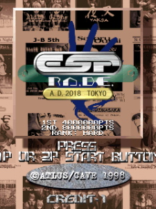 One of the coolest effects is when a cloaked spider tank crawls up to you and turns off its invisibility before attacking. There are also some cool parallax and scaling effects present, notably in the opening for Jb-5th when he dives down onto a table in the middle of a crowded shopping mall and smashes it in the most dramatic way you could possibly smash a table. Cave games are known for their excellent “take-off” sequences, and ESP Ra.De. is no different. Much of the artwork was done by Cave regular Junya Inoue, better known as Joker Jun, the man behind the art styles in Dodonpachi, Guwange, Dangun Feveron, and many other of Cave’s games. You can find a lot of ESP Ra.De. Artwork by Joker Jun that can capture the drama perfectly and other pieces far more lighthearted and comedic.
