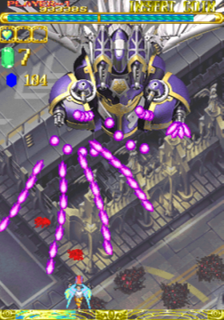 Even discounting the “bullet time” ability Espgaluda stands as one of Cave’s easier shooters, but veterans can still find a challenge here, especially if they’re looking to light up the high-score table. Every boss’s patterns grow more intense as you acquire more gold, though the final battle is a particularly tough one no matter how you slice it: Jakou takes on a long, grueling series of forms before finally going down, and his ultimate iteration takes only minimal damage while you’re in “awakened” mode, so forget about slowing him down too much (oh, and don’t even ASK what happens if you try using your “bomb” on him). If that’s not enough, players are free to seek a more difficult one-credit clear by not using “kakusei” at all – a couple of truly nutty challengers have even attempted to beat the game in constant “overmode”. Moreso than any of Cave’s releases up to this point, ESPGaluda tries its darndest to be all things to all shmuppers, and in large part succeeds.