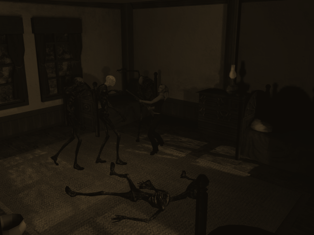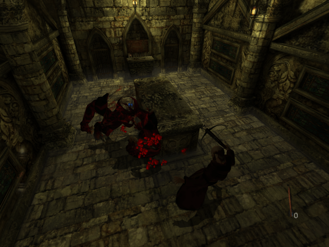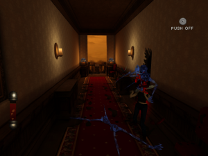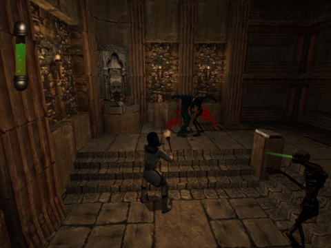 The game plays roughly similar to other horror games of the time. Characters can attack an enemy’s head, two arms, and torso. This adds some strategy, since a headless zombie will flail about or an armless zombie will have a hard time attacking. Players collect runes to unlock spells that can restore health & sanity, provide a shield, and summon enemies to control. However, characters feel too weighty in their attacks. It’s also too easy for enemies to hit players out of their attacks, with walls being a problem if the player is too close when using a melee weapon. Characters become winded and needed a rest after running. How far they can go varies by character, similar to Silent Hill‘s protagonists, with younger ones able to push farther running than older folks. One of the most unique enemies, a scorpion-like creature called the trapper, is a bit of a nuisance. They react to noise, and teleport the player to a strange realm floating platforms when they hear them, which sounds clever. Having to find your way out of shifting teleporters and random enemies, however, quickly becomes tedious, especially in a room full of the little buggers.
