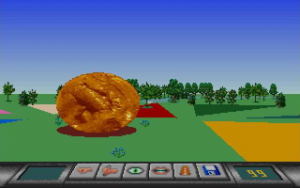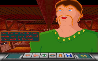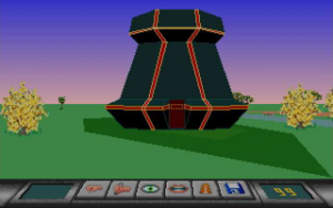 Another weird element lies in the transitions between the islands’ main points of interest. Exiting houses and places will turn the game in a first person action game, with a very crude 3D rendering of the island serving as a way to move from point A to point B. The only challenge in this part resides in the encounters with the savage denizens of Eternam. You’ll be attacked by strange winged snakes who will kill you if you’re not careful. To defend yourself, you can shoot lasers by pressing the space bar and… that’s pretty much everything about this phase. Used as a simple showcase for the game, these sequences come from Drakkhen, another title from Infogrames. (The 3D engine was created by the always-resourceful Frederic Raynal.) Already strange in a role-playing game, this feature is absolute nonsense in a game otherwise based on puzzles and dialogues. It’s worth mentioning that Drakkhen‘s protagonists make an appearance in this game; they must be killed in order to complete Eternam.