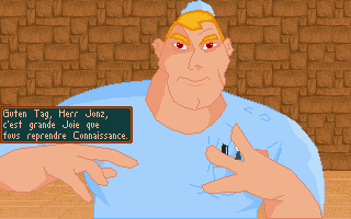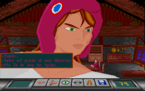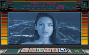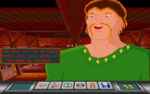 Unfortunately, Eternam‘s sky is clouded by two terrible dark spots. Quality-wise, the audio is greatly lacking. Adlib is the only driver available on the DOS version and doesn’t really help to enhance the lackluster music. Like Hubert Chardot, Frederic Mentzen is an old Infogrames veteran. He worked on the soundtracks of Drakkhen, Alone in the Dark 3, V-Rally and many other secondary games in the studio, and wasn’t really offered a good canvas on Eternam. A CD version was released later on but the only real addition is voice acting. The actors seem to have enjoyed themselves quite a bit and did a decent job, but the same thing can’t be said of their implementation. Between the awkward silences and the random cuts in the speech, Eternam‘s dialogue feels more like a Luis Bunuel movie than a chatty adventure game.
