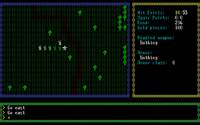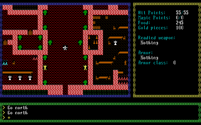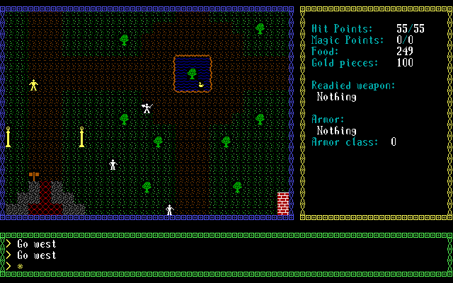 Actions are turn-based and take place on a tile-based map. The game makes use of a modified ASCII character set for the graphics, which creates the blocky sort of world that should be very familiar to a seasoned RPGer. Dialog is short, typically consisting of only a few lines of text and virtually no conversation choices. The combat system is very simplistic; you attack using the “A” key followed by a direction arrow when you are adjacent to an enemy. A huge array of spells, different types of enemies, and the option of ranged weapons add some variety to the extensive (and repetitive) amount of time spent in combat.