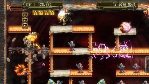 As the title implies there are a reasonable amount of explosions, but compared to Weapon of Choice it doesn’t feel nearly as fleshed out. (It was developed in just over a month, which accounts for it.) They are many stages and they’re all a single screen in size, with the main goal to collect gold, destroy stuff and get to the exit. Since you have a fairly large life meter and can continue at the beginning of the stage, it never feels like you’re in much peril, so it also loses that same old school sense of danger (unless you want to try to play through the whole game without dying – it’s not a particularly long game). It’s still a whole lot of fun though, especially when you jack the speed up to 200%, bounce around using the shield, and just wreck things up. Plus the silly interactions between doofus hero Atticus and his commanding officer are amusing. The PC version adds several more enemies too, which gives it more variety than the XBLIG release.