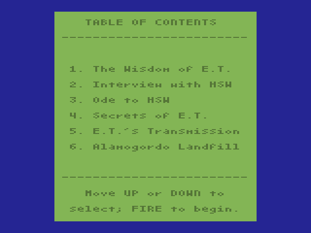 Michael Rideout (the programmer who won the Swordquest chalice) and Charles Gray created the E.T. Book Cart. It's an ebook, on a physical Atari cart. Gamers can plug the Book Cart in between rounds of E.T. if they're getting too stressed out. It contains interviews with Howard Scott Warshaw, quotes from ancient philosophers, an in-depth playing guide, theoretical essays by Hahn on the virtue of randomness, conspiracy theories about the Alamogordo site, and a small minigame based on the conspiracies.