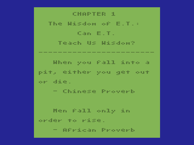 It is literally the most counter-intuitive control scheme ever. If someone were to suggest this for a modern game, people would take it as a joke. There are so many little things modern gamers take for granted in a video game. There are so many small victories. Yes rescuing Peach is a victory, yes dunking Bowser is a victory, and yes completing a level is a victory; but what about jumping from the ground to a block, running in a straight line, or just walking into a wall without dying. In E.T. everything hurts and the controls are so counter-intuitive that moving in a straight line requires logic, geometry, memorization, and a notepad.