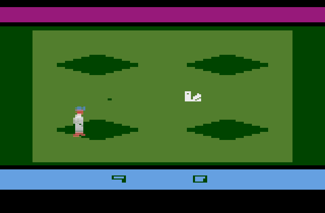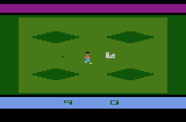 None of the enemies in the game are really threatening. They just screw around and waste your time while E.T. slowly dies. The humans are easy to avoid, but they appear without warning at the edges of the screen, sometimes instantly on top of E.T. It divides the game subtly into two parts. First E.T. explores the map to make note of the power zone and phone piece locations. As long as E.T. is not holding a phone piece, the agent really has no impact on the game. The scientist/kidnapper is actually helpful in the exploration half, because he'll walk over a lot of the hidden power zones in the process of kidnapping E.T. After you've mapped out the important stuff mentally or on a napkin, then grab the candy, assemble the phone, and call the space ship.