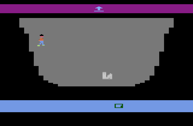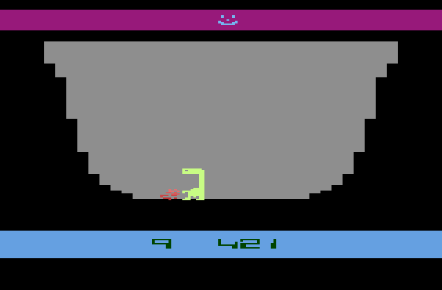 E.T. can only perform one action in the pits: float. Hypothetically, since the Atari has only one action button one might expect it to: float. That's not even remotely the case. If the action button is held down, released, or tapped E.T. will plummet to the pit's bottom and take "fall damage" from it. The action button must be released and then held down until E.T. extends his neck. This only enters a "float mode". Once in float mode the joystick must be pressed up to slowly float out of the pit. Once out of the pit the joystick must be pressed left, down, or right. If the action button is pressed or held down E.T. will immediately fall back into the pit, and if the joystick is pressed up, E.T. will fall back into the pit, but not immediately...