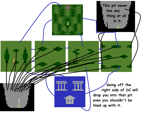 If the pits weren't broken enough, one screen has bonus pits. Every "side" screen has four pits that may or may not have something nice in the bottom. One screen has an additional four dummy pits that will always be empty. What makes this design choice even crazier, is that these useless dummy pits are positioned at the edges of the screen, so if E.T. walks onto the dummy screen without thinking about it, he immediately plummets into a pit.