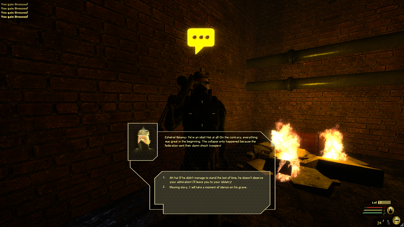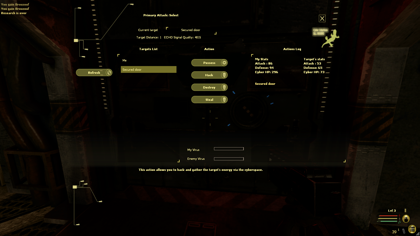 Of course, since this is an RPG with a leveling system, you can get stronger. You can make this faster with brouzouf, a currency you earn from killing enemies the game politely informs you that you earned with a “you gain brouzouf” notice on the top left. Brouzouf can be spent at the base for new weapons or magic, among other things, and you can also go in your menu at any time to fund research or buy cyber parts. Research unlocks as you pick-up silver briefcases that randomly drop from killed enemies, and you can use a slider to assign scientists to a given research to speed up their unlock. They allow you to buy certain stuff, give permanent stat buffs, and other fun stuff. There are also some that are completely useless, because trolling in a major part of this game’s core design.