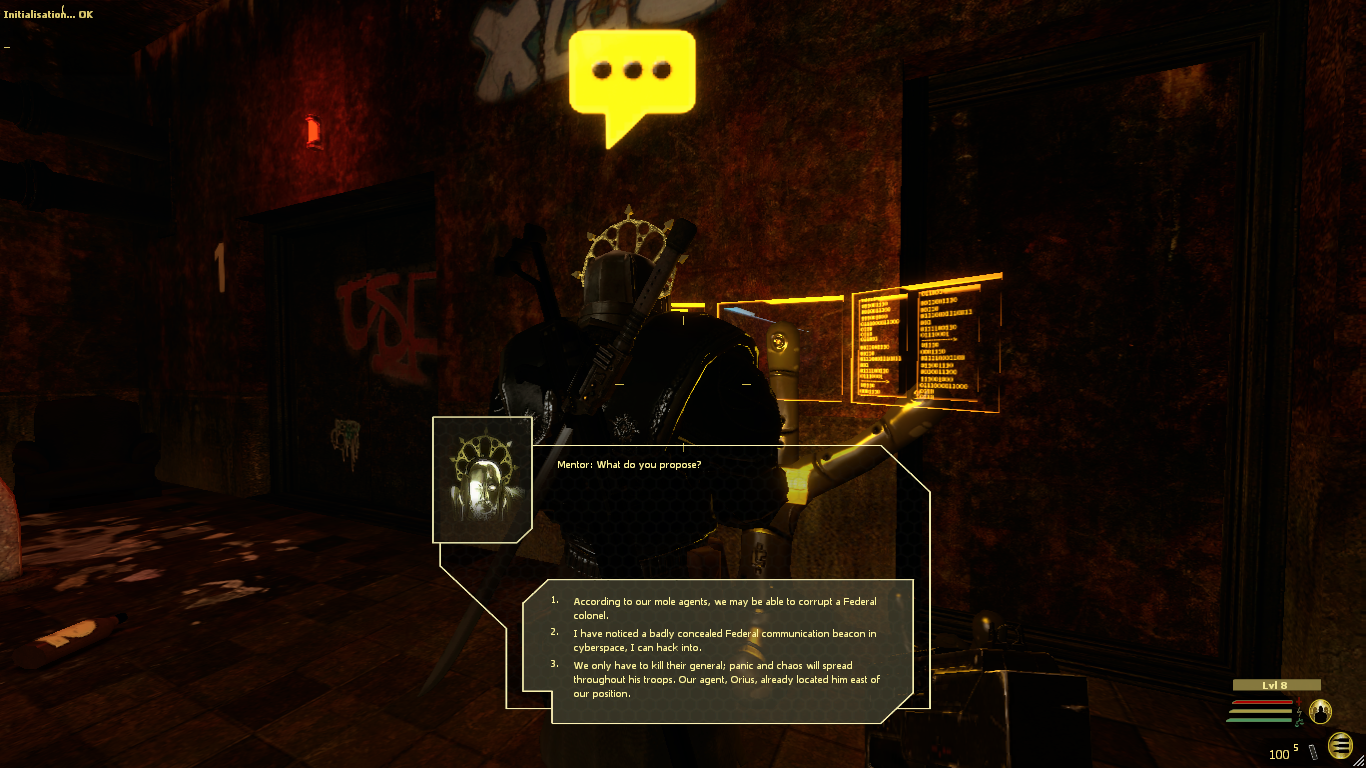 A nice bonus is that actually playing E.Y.E is a blast. The controls are smooth and easily customized to your liking, you can even change enemy spawns and difficulty. Getting the hang of things is challenging, especially with the dozens of tutorial videos included being generally useless, but once it clicks, it really clicks. As an FPS, the game has some great toys to play with, and the magic lunacy just adds to it. Mission design is also very open, like an immersive sim, even letting you hack enemies to fight for you (though you can get hacked back if you fail which sometimes makes your brain explode). Hacking is also pretty cool in itself, done with an active-time battle system where you load up actions alongside your target and try to balance keeping up defenses, wearing down enemy offense, and bringing their health to zero for the win. You even have dialog options at points, which means you get more amazing dialog, which is always welcome.