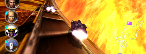 If anything, F-Zero GX is one for the eyes. The ships are modeled in loving detail and even the pilots, whose appearance doesn’t matter at all during the game, are fully modeled 3D characters in the menus and endings. But the most stunning part were the circuits: Before each race, the cameras give aerial looks at the surroundings, with their flying structures, endless skyscrapers and meteorological phenomena like asteroid storms.