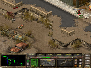 Fallout Tactics suffers from slow pacing which while not uncommon to the genre, ends up feeling quite annoying because of how slow the movement of your squad is when hiding behind cover or crawling (those positions affect your visibility and combat effectiveness – prone position is good for the aforementioned crawling as well as sniping, hiding behind cover is helpful during shootouts and standing is the only position with no melee penalty). The pacing, along with terrible pathfinding (so bad that it often results in your squadmates dying), is the main issue spoiling the enjoyment of sneaking and fighting through the game’s large, usually well-designed levels.