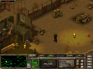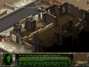 Tactics tries to adapt Fallout’s SPECIAL system to stealth-heavy real-time (optional turn-based mode is activated only while in combat) tactics gameplay not unlike Commandos: Behind Enemy Lines. The player’s squad is always outnumbered by the enemies and needs to avoid enemy patrols, set up ambushes and avoid triggering an alarm. Positioning your squad is always an important concern, both to gain tactical advantage (encircling enemies, gaining higher ground) and to avoid friendly fire. Keeping in line with Fallout tradition, scavenging is an important part of the game as apparently Brotherhood of Steel doesn’t give equipment to its members, forcing them to buy everything instead – and you’ll want to have a lot of stimpaks, ammo and a decent armor at all times. Of course most of those things are a bigger concern near the beginning of the game than near the end as it’s not impossible to make a small fortune and buy all the best items the quartermaster has to offer.