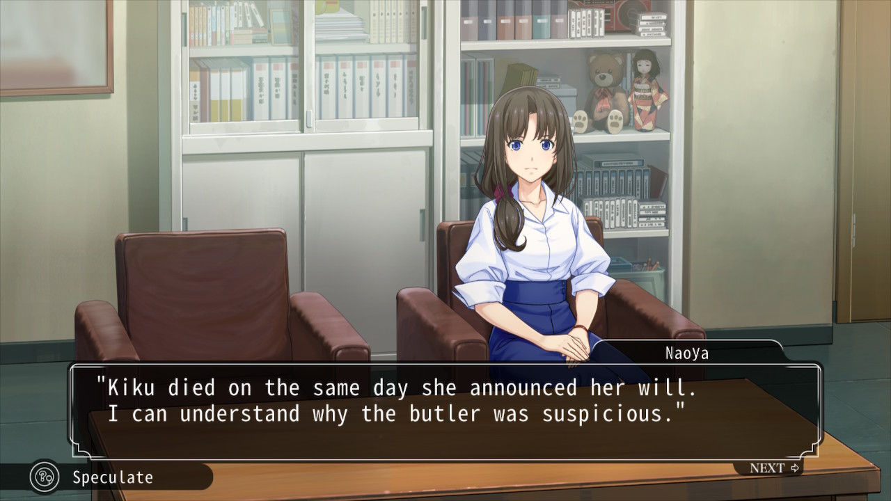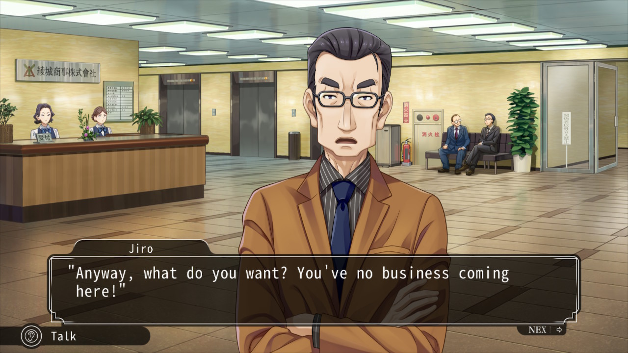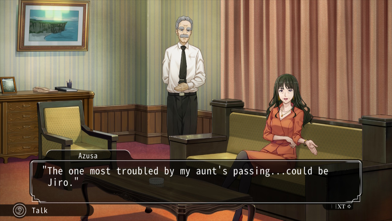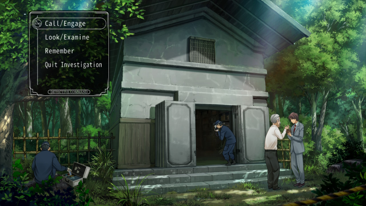 What’s most exciting about these two games coming to the Switch, is that it marks the first time the first game, The Missing Heir, is made available in English. For the first hour or two, the remake does a great job of making the narrative flow better than the in original version. As was pointed out in the article for the FDS version, the game is inherently talky and slow, but the addition of the voice acting and new exterior shots for each location you visit goes a long way to improve the narrative immersion. The atmosphere of the game has also been much improved and is one of the strongest points of the remake; gone are the blue-themed backgrounds of the original and they have been replaced by lush countryside environments, complete with leaves and grass animated to move in the wind, and ambient noises such as the sound of crickets. The game is now divided into 10 chapters that each constitute a day (including a day-night cycle for all the backgrounds), and the mechanic where you need to go back to the office to consult your colleague Ayumi ever so often makes much more sense now, since you will always do that at the end of a day/chapter. The voice acting and animation of Ayumi’s character is excellently directed in the remake, and she does really feel like a part of the team now, which was one of the concerns of the original version where she felt more like a game play device than a fleshed out character. Interestingly, within the Switch remakes, the acting portrays her as a much more confident person in The Missing Heir than in the chronologically earlier The Girl Who Stands Behind, which makes for a nice little character arc.
