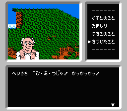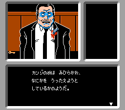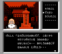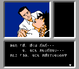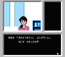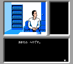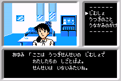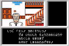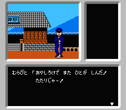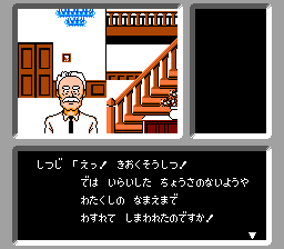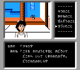 The game came on two disks released two months apart, but should be seen as one single game, as the second disk can only be started when the player has finished the first. The first disk (Zenpen) is sadly a slow an mostly uneventful affair that focuses mainly on setting up the intricacies and intrigues of the Ayashiro clan and their staff. It is not until the second disk (Kouhen) that the game starts to pick up pace, and this disk does overall feel more polished and has some minor improvements such a few redrawn locations and character sprites, and giving the protagonist a small inventory. There is even a 3D maze at the very end of the game, yet another thing the game copies from Famicom Portopia. The re-released version in the Famicom Mini-series on the Gameboy Advance combines the two disks into a single game (Zengouhen: “first and final parts”). This is probably the best way to play the game since there is a lot of disk swapping and risk of getting disk errors on the FDS version.