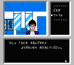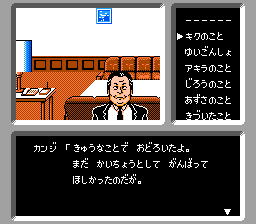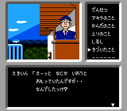 Gameplay wise, Kieta Koukeisha uses the same menu-based commands and occasional cursor interaction that the Famicom Portopia port established. The gimmick command in this game is the “Remember” option, which can be used to try to regain some of your lost memories after certain key conversations in the game. You also need to return to the detective agency from time to time to discuss and summarize current events with Ayumi. At first, this is a welcome addition that helps highlight key plot points, but as the game goes on this starts to get in the way of the narrative flow by making you go home to summarize things instead of just following up on your new leads. Since the FDS allowed for saving your progress to disk (this was before battery backup-cartridges), this was likely the game’s way of establishing natural points to save and turn off the game.
