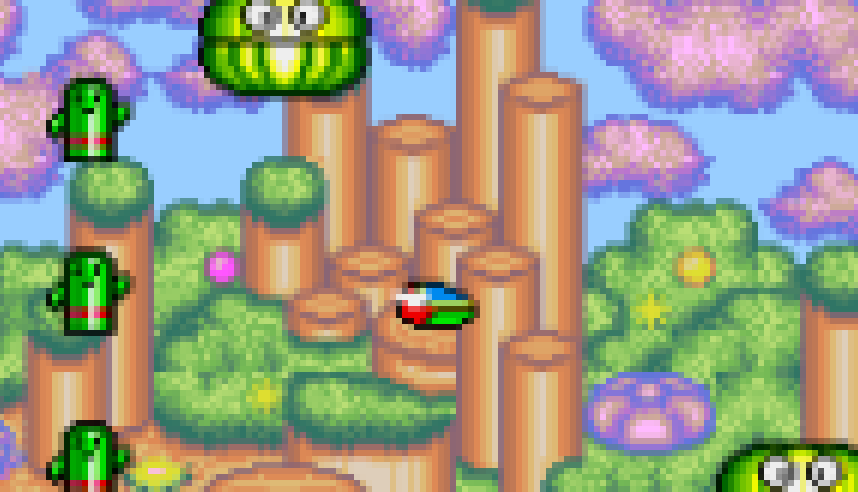 Since the game was developed from the tiny Game Gear screen, Fantasy Zone Gear removes the status bar from the playing field, which means there’s no radar, or even any indicator of your weapon ammunition. In spite of this, the game still feels rather cramped. From a technical standpoint, it feels poorly programmed, as the animation and movement is distressingly choppy. The controls are also a bit floatier than the other games, so it’s way too easy to accidentally stumble straight into an enemy.