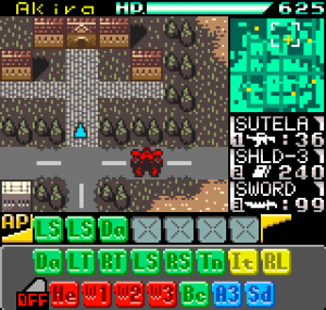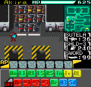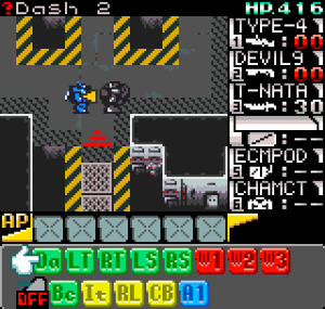 In a nutshell Faselei! is a turn-based strategy-RPG where instead of controlling several characters to perform a single action in alternating turns, you control one character (a giant mecha) for several actions in each turn. You do this by queuing each of your actions and then letting them play out against the enemy’s queued actions. The premise is that your mecha (or Toy Soldier, referred to as a TS), has a CPU which starts off with the ability to remember 5 actions, and can be upgraded to queue 6 and later 7 actions. Each action meanwhile is based on a series of “program chips” you collect.