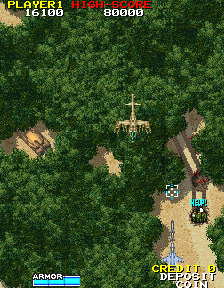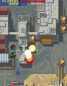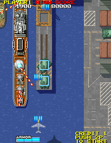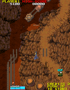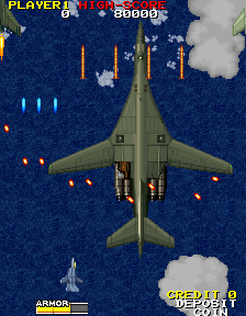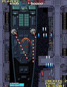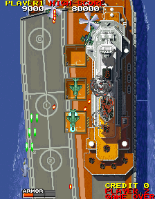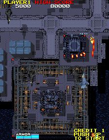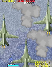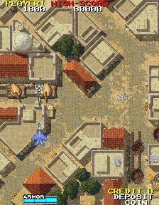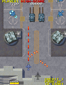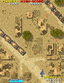 Graphically, Fighter & Attacker suffers. It’s not that it’s bad, but it feels two years behind the pedigree of its contemporaries. A few stand-out rock cliffs and intricate bases are padded with bland sand, sea, and asphalt backdrops. Worse yet, the lack of stark outlines of your ships can lead to losing them in the texture of the level, leading to cheap hits. A few touches like tank tread marks and destructible buildings don’t make up the flashier, more colorful titles from the competition. The less serious and more forgiving Aero Fighters of the same year serviced as the better military vertical shoot-em-up experience overall for the arcade public.