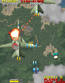 The road to blasting the dictator to dust is as difficult as sending one or two planes to battle a fleet would truly be. There are no lives or extra ships given the player. Instead, planes have an armor that can withstand 3 hits (on default) before being blown out of the sky. Earning enough points will refill a lost bar of an aircraft’s health. However, the tens of thousands of points necessary to repair damage is overshadowed by the bombardment of enemy fire coupled with each plane’s brief mercy invincibility from each hit taken. Lose your armor? Then it’s game over. Adding to the “realism” is the lack of any powerups. Your only source of offense to work with is the weaponry given to each plane at default. The fact alone that there isn’t even the genre’s stock screen-clearing bomb (outside of continuing from a downed life) should be a sign of how ruthless and unforgiving the game is on your survival. Adding insult is the relative weakness of your air firepower to threats blitzing the player later in the game, with many intercepting planes better armored than you. The better alternative is to play more defensively to dodge the curtain of orange-yellowy death with the peppering of air and ground button-pressing to immediate danger.