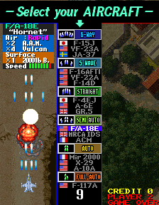 The gameplay is similar to Namco’s own classic Xevious. The screen scrolls vertically with air and ground targets to blast. However, F/A did take pages from other popular vertical shoot-em-ups of the era, particularly Raiden‘s bonus system. Hidden within buildings, tanks, and enemy ships and jets are POWs to save, be they diplomats or GIs. Collecting them and making it to the end of each of the 8 stages unscathed nets the player or players large bonus points. Set over the skies of an Middle Eastern conflict, the setting and theme is a lot more down-to-earth with its Gulf War-era current-day setting. The campaign even plays out as one continuous stretch of ground to cover within a 24 hour period, complete with a transition to night and back to day. The only break of the near-seamless shift from level-to-level is the jump to aerial-only dogfights on two of the stages, negating the use of any ground attacks.