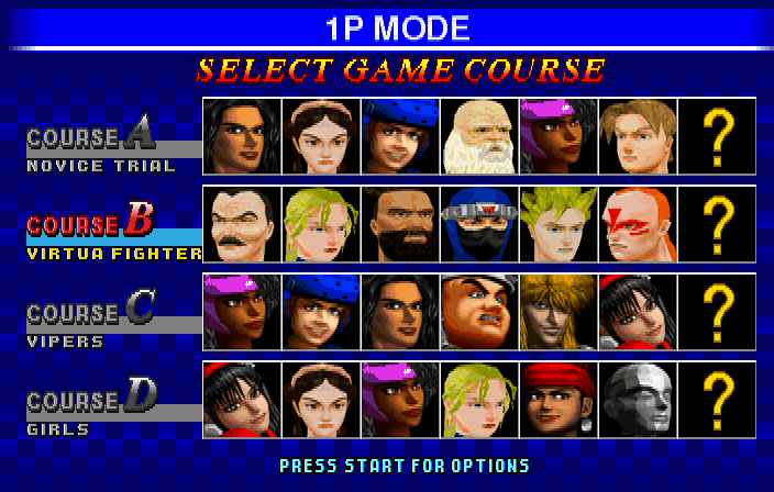 The game allows to switch its basic physics between Fighting Vipers and Virtua Fighter modes, but some attributes are limited to certain characters: Only the Fighting Vipers cast, for example, wears destructible armor for their protection. While the Virtua Fighter portion is mostly based on the second game, it also introduces the sidestep from Virtua Fighter 3, making this the mechanic’s first appearance on a home console. The characters also get some of their added moves from Virtua Fighter 3, and while the new characters from that game aren’t in, Janet’s fighting style is mostly borrowed from Aoi. All stages from Virtua Fighter 2 are in alongside the wall-enclosed Fighting Vipers arenas, but the ring outs are gone. Their place is filled by an infinite vastness of perfectly even floor in all directions.