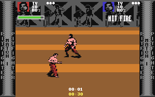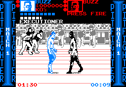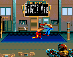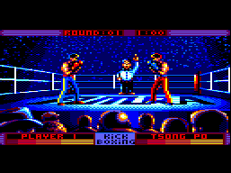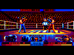 The game tries to convey a bit of a career feel in between the fight. You go up against ever stronger opponents, who all have different heads in the options menu, but look just the same in the actual game. If the difference in abilities is too high between the opponents, however, the game won't let them fight each other, so you first have to get some training to tackle the strongest champions and snatch their titles. The training program involves rope skipping, done by quickly jerking the joystick between left and right, a poorly explained weightlifting unit and a reaction test where targets spring forward at three different heights, and you quickly have to press a direction to hit them. The latter test is the only one that works out reliably, though, so usually it's faster to boost up resistence, strength and reflexes by fighting weaker opponents multiple times.