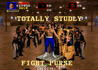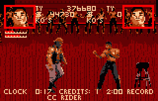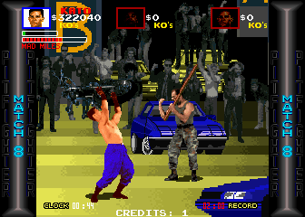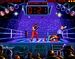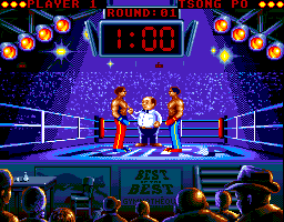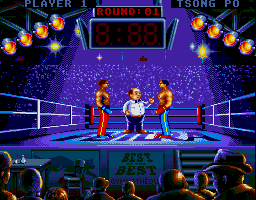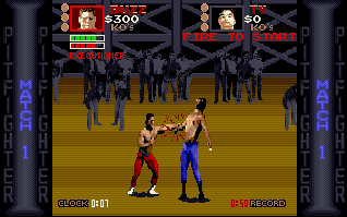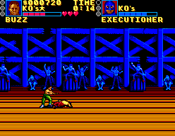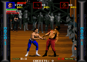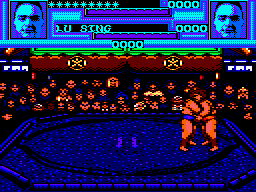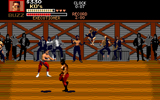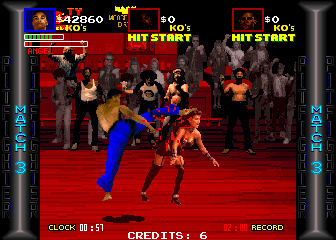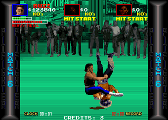There are three buttons, used for kicking, jumping, and punching. When pressing all three at the same time, the player character executes a special attack. There are a few interesting ideas here that were taken from beat-em-ups. There are occasionally weapons on the ground (like motorcycles!) that the player can attack with. Sometimes even spectators attack the player. Characters can walk into the crowd, but will get shoved back out by crowd members. There are also "Grudge Matches". During these, the goal is to knock down the opponent(s) three times, though loosing these doesn't end the game. Certain enemies have to be fought twice during the course of the game, and Chainman Eddie is fought along with a clone of himself in the level before the final boss. These differences from standard fighters do nothing to save the gameplay, though.