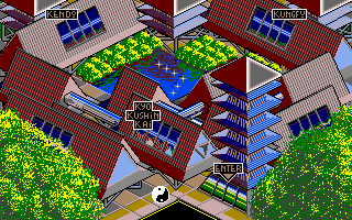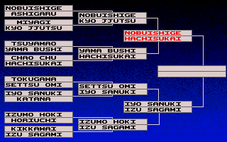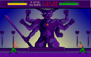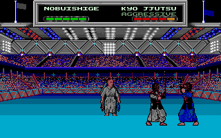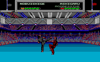 All three disciplines are controlled in Exploding Fist manner, where kendo as usual has a wider range of defensive stances. Sadly, responsiveness and hit detection are not quite up to snuff. Oriental Games has the same problem as Chambers of Shaolin with blows that hardly ever connect. Despite the conservative sports competition makeup, fights are always decided by health instead of points. The health bar consists of only five notches, but they turn from green to grey, orange and red in succession, so actually a lot more hits are required to win. (The 8-bit versions use a more ordinary, slowly recharging health bar.)