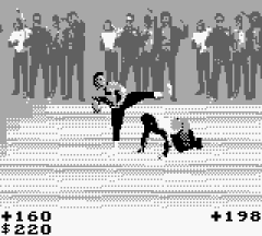 There is only one single attack available, along with the ability to duck and jump very high. The game doesn't really innovate in any respect. However, certain levels have platforms that can be jumped onto. This feature really only allows players to pointlessly avoid their opponent and only makes matches drag on. Regardless of which type of arena the fight takes place in, the AI opponents jump around constantly, avoiding getting hit. The computer completely refuses to play aggressively, so more or less the entire game is spent striking at the air, trying to catch them every once in a while. The game also has poor hit detection, so it's difficult to find anything enjoyable here. It's only worth noting for being one earliest handheld fighting games.