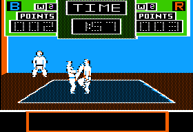 The angled view is not just for show - other than in most later games, the combatants can move up and down, although it is limited to three levels, similar to later Fatal Fury games. Using the joystick in combination with the fire button, players can execute 8 different moves, mostly kicks of course, giving the discipline, and a low block (the default stance blocks high attacks automatically). Another factor that distinguishes Black Belt from most later genre entries is its insistence on strict competition rules. If a player stalls the match by avoiding confrontation, leaves the mat or turns around, this is punished with a warning. Six warnings result in a disqualification, but even a single one can decide the match. Otherwise the winner is determined by score. Each hit gives a point, but missing gives a point to the opponent. It's also possible to knock down the opponent, upon which he will be counted out.