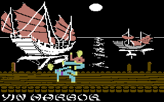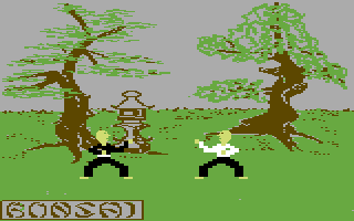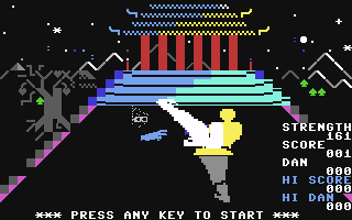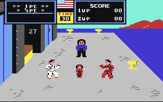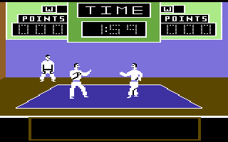 If we go with the 1983 theory, then this game would be the originator of the formula seen later in Way of the Exploding fist and its many imitators: Two Karate Guys stand facing each other, and a variety of martial arts moves can be executed by holding the fire button in combination with the joystick directions. The controls are terribly unresponsive, though, making this game nearly unplayable. Even though there is no score displayed on screen, it takes seven hits to move on to the next stage, something that's hardly ever going to happen without cheating.