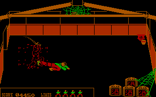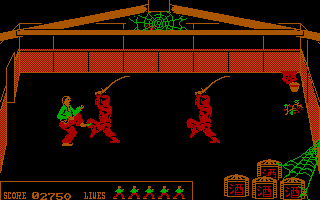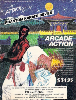 The Attack of the Phantom Karate Devils is certainly on the fence genre wise. It barely meets the requirements for a fighting game, so here it is. The plot involves a "karate guy" fighting invisible ninjas. After killing a mostly invisible ninja a door to the next screen will appear. Then a trek across a bridge and other terrain will occur with the same gameplay.