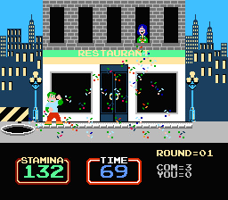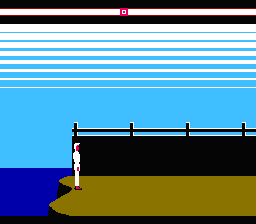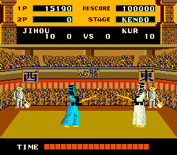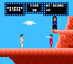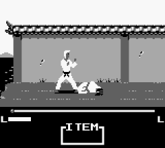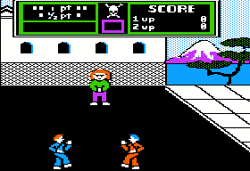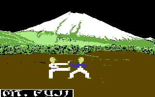 The two Karate Champ games are so similar otherwise that they are generally mistaken for each other. Data East even released the ports of Player vs Player simply as Karate Champ. All of the contemporary home ports are terrible. The Commodore 64 version is yet the most faithful of them, although of course the controls are changed to the direction+button system of other home computer fighting games and the hit detection is off. It also loses the announcer speech samples. The Apple II version has none of the bonus rounds, a fact it proudly announces on its startup screen. The NES version is the only one that retains the speech samples, but the only bonus stage is the one with stuff flying over the screen. The control scheme using both of the NES' action buttons is a bit counter-intuitive, especially there's hardly any animation left and everything feels choppy. All the backgrounds in this version are new.