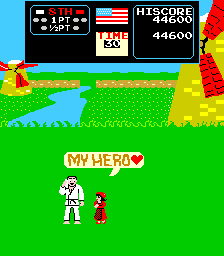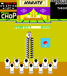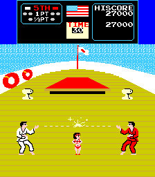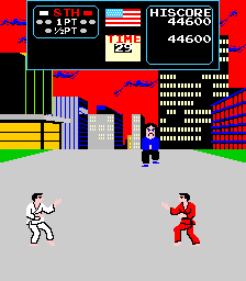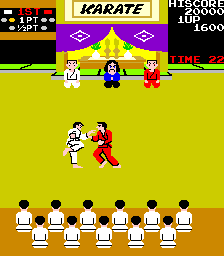 Developed by Technos and published by Data East, Karate Champ is kind of like the Virtua Fighter to Yie Ar Kung-Fu's Street Fighter II. Or vise versa. Karate Champ and Yie Ar Kung-Fu are more or less responsible for establishing the basics of the genre in Japan and are both directly influencial to what came after them and before Street Fighter II. However, Karate Champ was even more primitive than Yie Ar Kung-Fu.