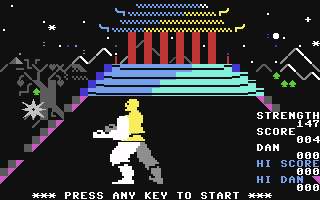 Super Black Belt Karate is a curious bit of software. The title screen bears a 1983 copyright. If that is accurate of the game's release, then it is one of the formative efforts in the genre and an important part of its history, but nothing else is known about its developers, or whether it was even published at that time. The cracktro in some of the available disk images is from 1986, which would put the game in a very different context.