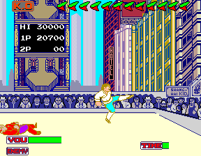 The animations are very sketchy as well, the jump kick looks like it slices off the enemy's head clean at the neck. Some of the backgrounds are drawn rather nicely, though.