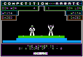 Competition Karate is a unique oddity, as it is more of a strategic simulation than an action game. At first the player has to create one or several karateka by selecting a teacher and dice rolling a number of different stats like in an RPG. The teacher's specialties determine which attributes will be upgraded the most during training, which simply consists of more random increases of stats.