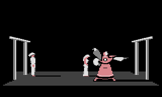 Then comes a round where the player has to deflect arrows, followed by five levels of kendo. These are pretty difficult. The winner is the first to land two hits. Then a second arrow deflecting round. The rules about stepping off the mat, ties, and the timer apply here as well. The last seven matches are gladiator matches. These are really difficult. The first to land a hit wins, as the loser is killed when hit by the opponent's sword. There is no timer, ties do not count, neither does the rule about the mat. After winning these, the game restarts at a faster speed.