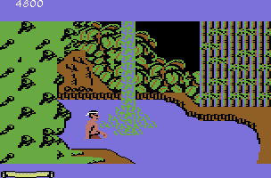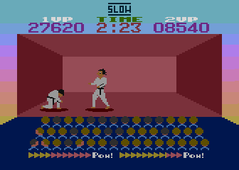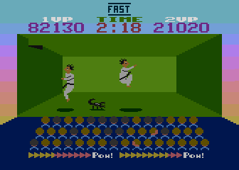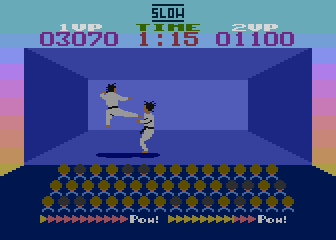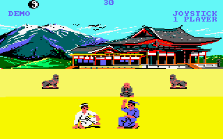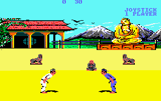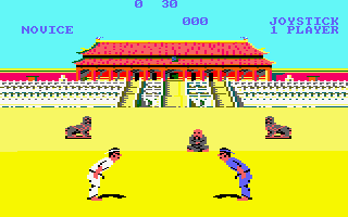 Author Adam Billyard also styled his creation after the arcade Karate Champ, but he made some unique variations. The joystick button is only used to turn around the karate fighter, which leaves only four attacks executed by holding certain directions - a punch, a normal kick, a crouching kick and a jump kick. While this severely limits the combat options, the health system is more complex. Hitting the opponent depletes his power bar, but it rapidly replenishes up to a certain point. Only when one combatant manages to completely empty the other's power bar, he goes down and both go back to their starting position to continue the bout. The more beating a fighter has to take, his power regeneration limit grows shorter and shorter, simulating fatigue. If one combatant falls below three nubs on the bar, the fight is over.