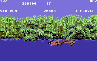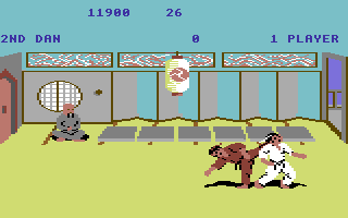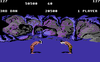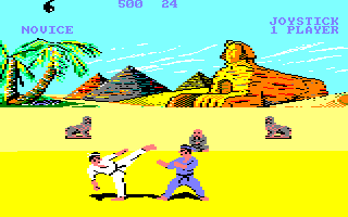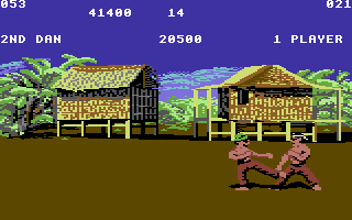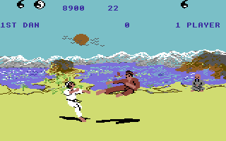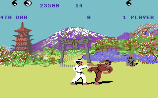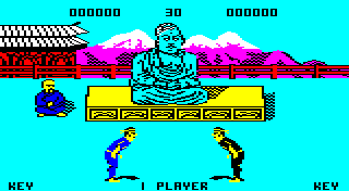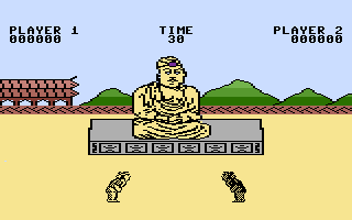 There were a few ports of this game. The Commodore 64 version is by far the best with superior graphics and sound. The Amstrad CPC version only has one background (which is not seen in any of the other versions) and no music, but it is still better than any of the remaining versions. A bit later, there was also a "+" version released, which has nothing to do with the Exploding Fist+ covered below. Instead, is just the same as the original, only with four backgrounds to choose from. Two of these are based off backgrounds from the other versions, while the other two are entirely new. While all the other backgrounds have vaguely oriental motifs, one totally rips off the Egypt stage from International Karate. The ZX Spectrum has all the backgrounds, but of course its audiovisual capabilities are far below the C64, and the controls even less reliable. The BBC Micro and Commodore Plus/4 versions both have only one background, and don't look or play very good.