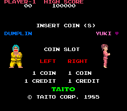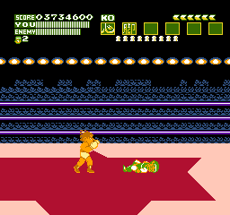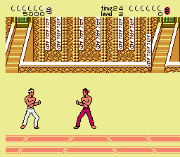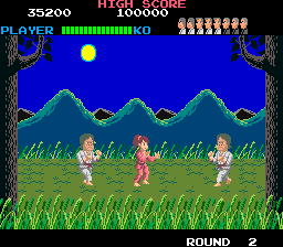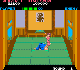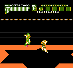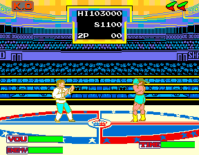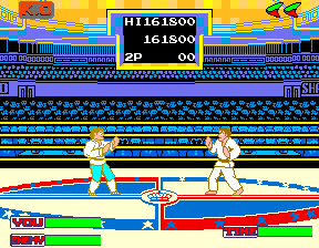 Every once in a while, a scorpion is dropped into the arena, taking down the fighter who fails to jump over it. The game is played over two loops with four stages each, represented by a different color of the arena. If the strongest opponent is beaten, the tournament starts again at higher speed, but the game remains comparatively easy throughout. After the second loop, the final stage is just repeated over and over again. There is also a score display for both players, but when it goes above 99,999 points, it simply resets to zero.