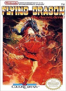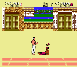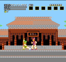 Two years later, the game was followed by Hiryū no Ken: Ōgi no Sho (飛龍の拳: 奥義の書) on the Famicom, which took until 1989 to get to the US as Flying Dragon: The Secret Scroll. This introduces a story mode. In between the proper duels are now sidescrolling beat-em-up stages, where the hero has to defeat a number of boss villains to get the key to the exit of the level. Every stage is followed by a number of battles, which work just like the arcade game, but are a bit easier, at least in the lower of two difficulty settings. Not only is the time window to react more forgiving, but there are also sometimes potions flying across the screen. If caught, they can be used at any time to restore a bit of health during a fight. The last opponent in each fighting game round turns into an evil Tusk Soldier when defeated, who has a nasty low fireball attack that can only be jumped over. There are now rare blue circles that denote an enemy's weak point, and the even rarer star icon which allows an instant KO. Some later opponents can only be defeated exploiting those. Finally, there's the Versus Tournament, where several players can partake and chose between representatives of various fighting styles for the first time in the series.