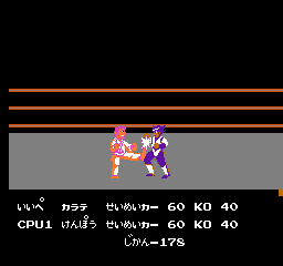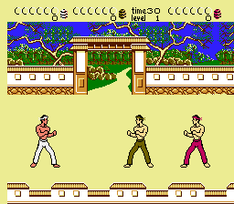 The game looks pretty good for an NES fighting game, with large, well-animated characters. There is a number of different backgrounds, although they all look rather similar, as if cut out from the same single scrolling stage. The background music is pretty exciting and very fitting, although it's still only one tune playing all the time. It's a shame that this wasn't released. Even though the gameplay is nothing special and the CPU is absolutely relentless, this would have been a nice addition to the NES library in 1989.
