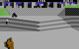 One of the most blatant clones of The Way of the Exploding Fist was International Karate, and Beam Software returned the favor with Eploding Fist+. So it was a knock off of IK+, a sequel to International Karate, which was a clone of The Way of the Exploding Fist, which, again, was a clone of Karate Champ. The main differences from The Way of the Exploding Fist are the changed point system (copied from IK+), and three active characters in each fight (also copied from IK+). It even steals the reduction to one single stage background from IK+! The bonus round where ninjas slowly approach and have to be taken out by throwing knives appears to be inspired by Sega's Shinobi, which had appeared in arcades the year before. The only new innovation is a cartwheel move that allows the fighters to get across the screen quickly.