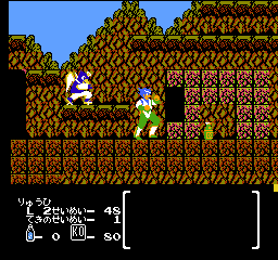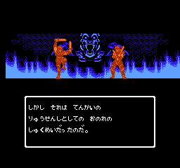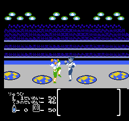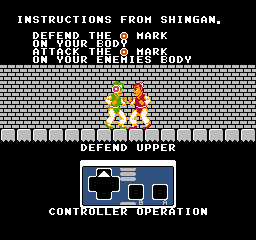 Hiryū no Ken II: Dragon no Tsubasa (飛龍の拳II: ドラゴンの翼) is a direct sequel of the first Famicom game that was released in 1989. This time there's an Action Mode, where the fights are just like in the previous game, and an Anime RPG Mode, where the timed attacks are replaced by turn-based menu selections. These are really boring, as often there's literally only one option to "choose". Both have the same story and side-scrolling stages, which are more non-linear, bigger and more annoying than those in Flying Dragon. The third Famicom game, Hiryū no Ken III: 5 Nin no Ryuu Senshi (飛龍の拳III: 五人の龍戦士) from 1990, finally gets rid of the terrible side-scrolling parts and changes the formula a bit, as now the second button is used mostly for jumping. It also offers the option for a vastly simplified control scheme, where one direction blocks all incoming attacks. The Game Boy version Hiryū no Ken Gaiden (飛龍の拳外伝), released in the US and Europe as Fighting Simulator: 2-in-1: Flying Warriors, feels like a mixture between the first and second Famicom games.